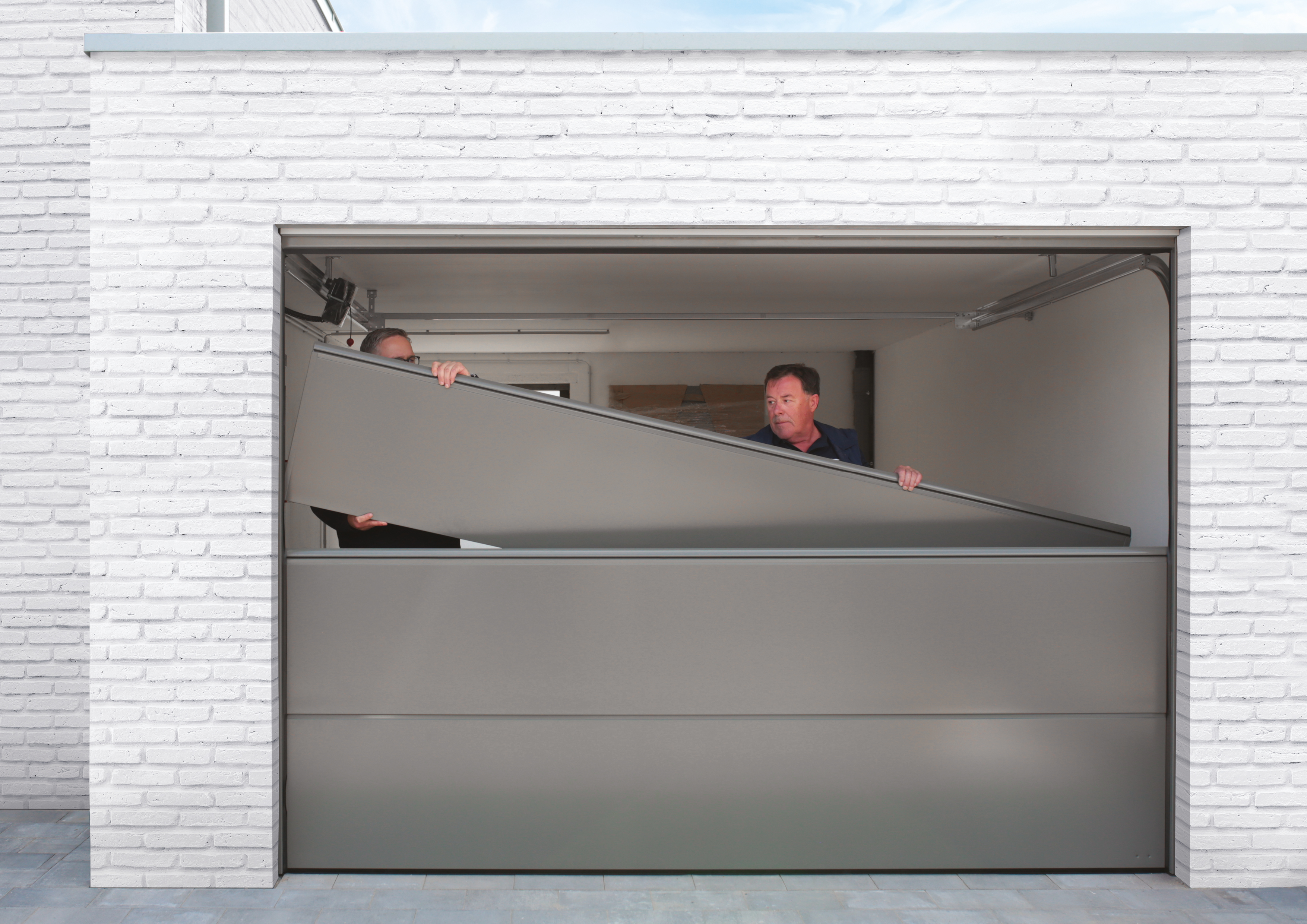 Una porta sezionale è composta da diversi elementi singoli, detti sezioni. Le singole sezioni sono collegate da cerniere. Il portone sezionale si apre direttamente sotto il soffitto del garage senza una sezione girevole. In questo modo si ha un accesso illimitato all'intero spazio antistante il garage. È inoltre possibile sfruttare l'intera altezza libera del garage. Il portone sezionale può essere azionato manualmente o elettronicamente tramite un pulsante, un trasmettitore portatile o un'app.